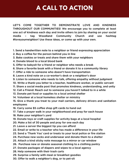 We invite you to join us in this critical and meaningful month-long campaign. Together, we have the opportunity to champion the commandment of Love Your Neighbor. We can go beyond making the statement and we can act together. Join along as we highlight things to do, ways to think, and actions to take, in order to show our community God's love!